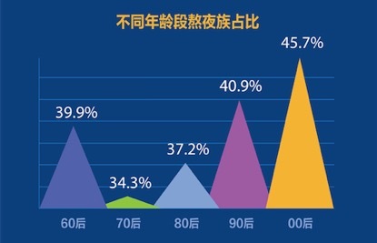 还在觉得90后最能折腾吗?报告显示,00后已经成为熬夜最严重的人群,熬夜人群占比达45.7%。其次是90后、60后、80后以及70后。随着智能设备已经渗透到中小学生人群,00后网民晚睡并不稀奇。90后正值活跃期,同时工作压力渐增,熬夜已经成为常态。但排名第三位的60后群体是怎么回事?有分析认为,60后上有老下有小,在中年的时期感受到网络世界的新奇,多熬一会也不难理解。