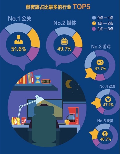 从熬夜族的行业分布上来看,公关、媒体、游戏行业最苦逼,经常熬夜;动漫、投资领域的人睡得也很晚,其中公关行业以51.6%的熬夜族位居第一。这一群体可谓是与网络结合得最深入的,工作和生活已经和网络密不可分。在感受到工作快节奏的同时,越有压力越要在网上停留至深夜也成为了常事。