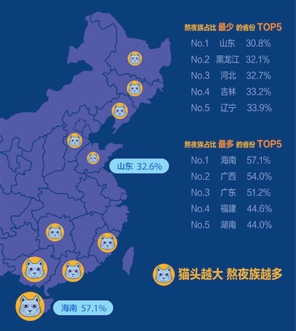 从地域分布来看,熬夜也呈现出了“南北差异”:南方睡得晚,北方睡得早。海南熬夜族最多,占该省用户的57.1%;山东人民睡得最早,熬夜族仅32.6%。黑吉辽等东北省份也普遍睡得早。知名急诊医师于莺表示,人类睡眠受到“生物钟”的影响,而生物钟则受到昼夜长短的影响。冬半年,南方比北方天黑得晚,因此,南方人相对睡得晚。而且,此时南方温暖如春,有各种夜市,夜生活丰富;北方天寒地冻,东三省零下十几度甚至零下几十度,人们只能窝在家里,早睡不失为一个好选择。