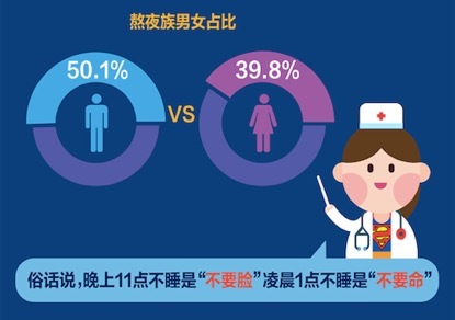 熬夜这件事,也“男女有别”:熬夜男性超过一半,熬夜女性不到4成。对于男性来说,工作压力可能更大,凌晨也常会有球赛、游戏等吸引他们。女性则更懂得保养,“美容觉”的理念也更深入人心。