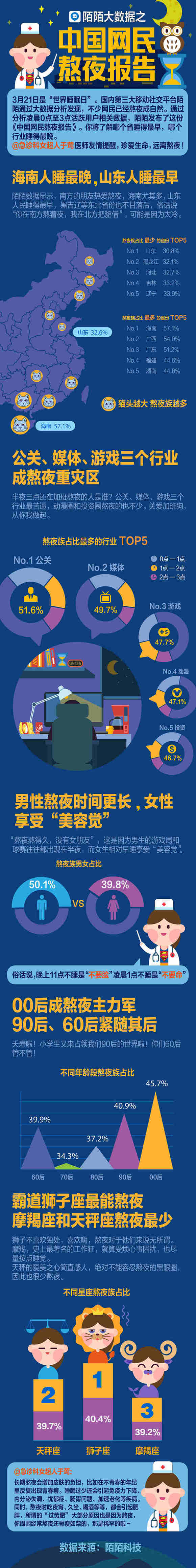 最近社交平台陌陌通过大数据发现,不少网民已经熬夜成自然。在陌陌最新发布的《中国网民熬夜报告》里,展示了熬夜族的地域、行业、年龄等不同维度的分布情况。数据显示,南方人比北方人更能熬夜,公关、媒体、游戏行业的人熬夜最为严重,00后出人意料成为熬夜主力军。
