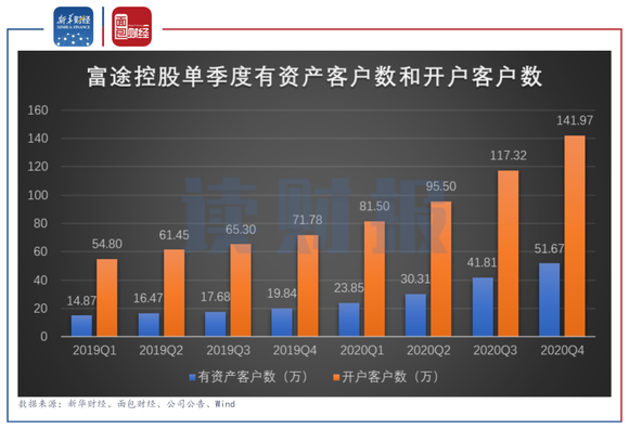 富途控股业绩较快增长充分受益于客户数的上升。数据显示,公司有资产客户数由2019年一季度14.87万上升至2020年第四季度51.67万。同期,开户客户数从54.80万上升至141.97万。