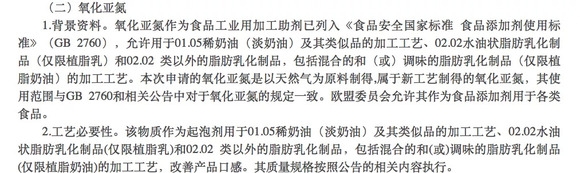 在《食品安全国家标准食品添加剂使用标准》(GB 2760-2014)中,氧化亚氮被划分在在需要规定功能和使用范围的加工助剂名单,并做了具体使用说明。