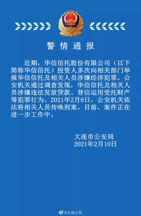 同样在2月10日,@大连公安微博消息,近期,华信信托投资人多次向相关部门举报华信信托及相关人员涉嫌经济犯罪。公安机关通过调查发现,华信信托及相关人员涉嫌违法发放贷款、背信运用受托财产等犯罪行为。