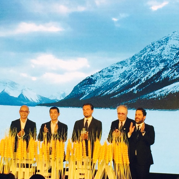 好不容易挤进会厅,却足足等了一个半小时,期间不断循环播放《荒野猎人》的配乐,由于背景音乐太过压抑,加上进场前排队挤得瘦了一圈,媒体朋友们不得不自娱自乐先嗨起来。