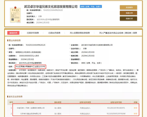 而在年关将至之际,该项目的操盘主体终于落定。企查查信息显示,2020年12月30日,一家名为武汉卓尔华谊兄弟文化旅游发展有限公司成立,该公司注册资本为3亿元人民币,由卓尔控股和华谊兄弟分别占股90%和10%。