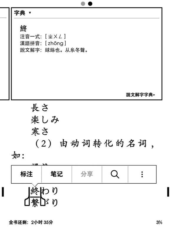Kindle自带两本字典,分别是《现代英汉词典》和《现代汉英词典》。读书时遇到生词,长按会出现解释,同时会存入生词本便于复习。