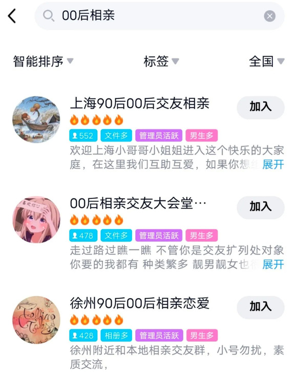 和这位年轻小伙拥有同样诉求的人不在少数。Tech星球通过在QQ上搜索相关的关键词发现,越来越多的大型线上交友相亲群都随之出现,而且多以三四线城市为主。