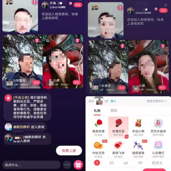小李对第一次主持线上相亲的情景记忆犹新,具体流程就是创建视频房间,再让男女嘉宾进行线上相亲,观众可以在房间里观看,如对异性嘉宾有兴趣,可以向红娘送礼,要求上麦,这点与YY的群聊模式相似。