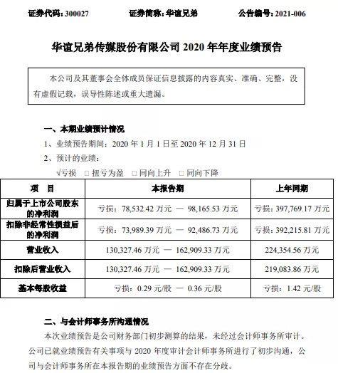 首先目前对于影视娱乐第一股华谊兄弟来说一点也不友好,其已经在2018年、2019年分别亏损10.93亿元、亏损39.6亿元,2020年业绩快报显示又将巨亏7.85-9.8亿元之间,三年累计亏损超过接近60亿元,相当于华谊现在市值的一半。