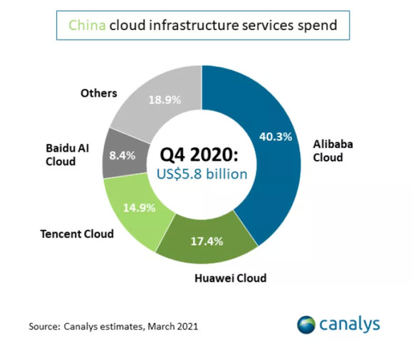 仅仅一年间,云服务市场便风云再变。近日,市场研究机构Canalys发布《China cloud services market Q4 2020》报告显示,华为云以17.4%份额稳居中国公有云市场第二,较第三季度的16.2%进一步上升。阿里云占比40.3%稳居鳌头,百度智能云异军突起,以8.4%位列第四,接下来的都被归入“其他”类别中。