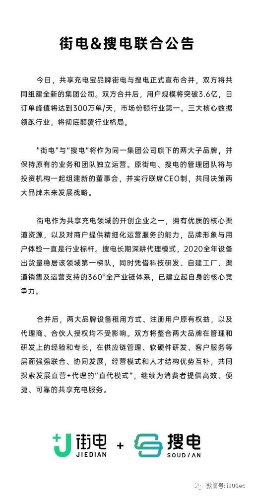 在怪兽充电上市当日,共享充电宝品牌“搜电充电”与“街电”发布联合公告,正式宣布合并。公告表示,双方将共同组建全新的集团公司。双方将共同组建全新的集团公司。