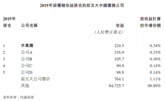 根据天兆猪业招股说明书可知,公司位于我国2019年前五大种猪收益榜首位,收益约为2.25亿元人民币,以收益计算的市场份额约为0.34%,领先第二位0.01个百分点。