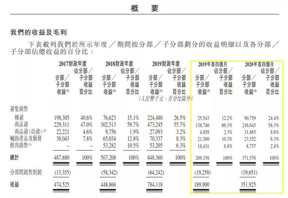 值得注意的是,猪价普遍大涨、头部生猪养殖企业出栏量普遍高增长的2020年前四个月,天兆猪业种猪销售占比仅为24.4%,商品(幼)猪合计销售占比为66.9%,销售收益分别为9075.90万元和2.49亿元;毛利分别为7933.20万元和1.50亿元。