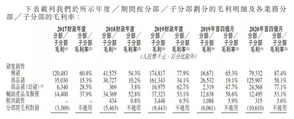 种猪同期毛利分别为1.20亿元、0.42亿元、1.75亿元,毛利率分别为60.8%、54.3%、77.9%。2017-2019年商品(幼)猪合计毛利分别为4137.00万元、3109.60万元、1.78亿元。