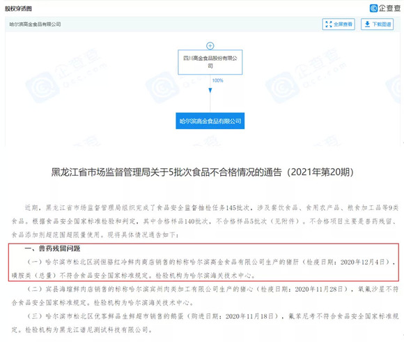 尤为值得关注的是,持有天兆猪业2.19%股份的股东金翔宇担任法人的“四川高金实业集团股份有限公司”(以下简称“高金集团”)被爆食品安全问题,旗下100%控股的“哈尔滨高金食品有限公司”因生产的猪肝有兽药残留问题被通告。