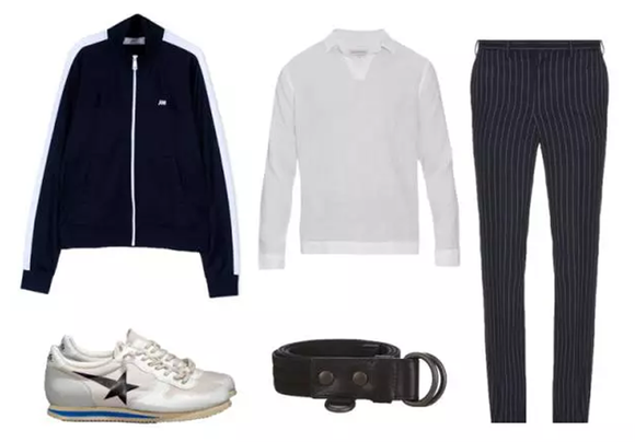 Look3:这个春夏时髦值MAX的造型,从前的黑帮制服,现在曼妙的拉链运动衫,要把下摆塞进裤腰才能称潮