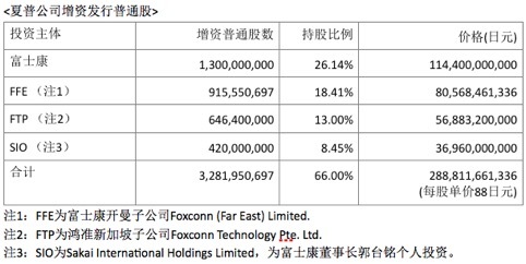 交易信息显示,鸿海在认购夏普增资发行普通股后,包括鸿海及共三家子公司合计将持有夏普增资后66%的股权。另外鸿海还将认购夏普公司增资发行1136.4万股的特别股。
