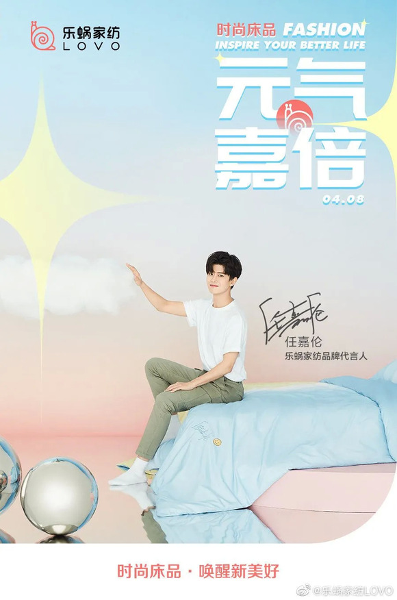 4月8日,任嘉伦成为乐蜗家纺品牌代言人。