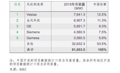 3月31日,风能行业第三方咨询机构MAKE发布《2015年全球风机制造商市场份额分析》报告称,维斯塔斯以约7.64GW的吊装量,成为2015年全球风机制造商市场份额排名第一的企业,中国的金风科技则紧随其后。