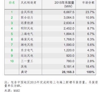 MAKE报告还指出,排名第六的海装风电以及排名第十的三一重工,二者在2015年新增吊装量的同比涨幅都较为强劲,他们的市场份额分别达到了6.3%和2.8%。