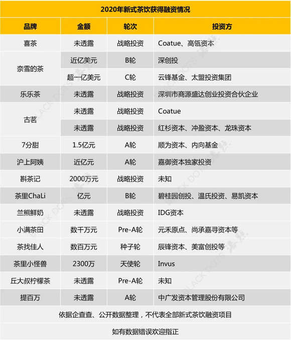 据公开资料显示,2020年针对茶饮品牌的融资共18起,据已披露的数据显示,截止年底已有50亿人民币进入新式茶饮赛道。