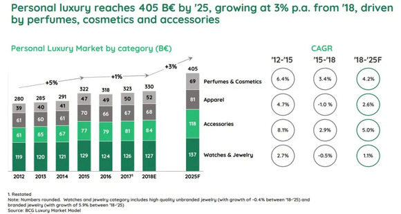 数据显示,奢侈品市场规模正在不断扩大。自2018年,奢侈品以每年3%的速度增长,主要依赖于香水、化妆品、配饰等个人用品等品类。