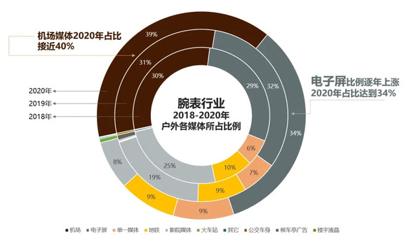 受制于新冠疫情影响,2020年全年腕表行业户外广告整体投放有所下滑。但纵观近3年的户外媒体投放趋势,机场媒体、电子屏媒体仍然是腕表行业最为核心的2大媒体选择。