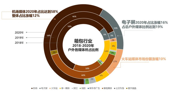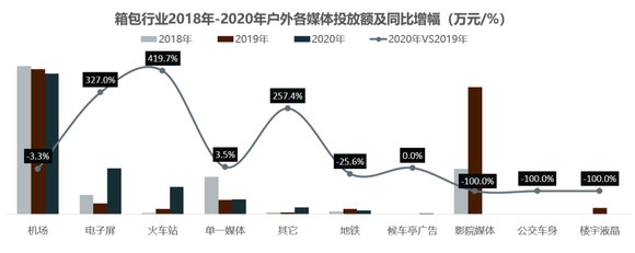 2020年全年箱包行业24%的跌幅主要来源于影院媒体的停滞,机场媒体发展稳定,电子屏、火车站媒体出现逆势大增。从近3年的户外媒体投放趋势来看,机场媒体、影院媒体、电子屏是箱包行业最为核心的3大媒体选择。
