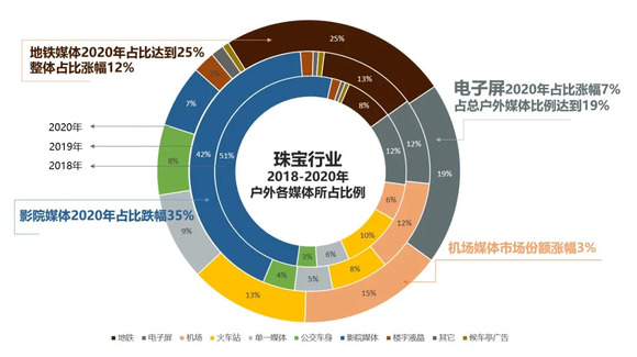从近3年的户外媒体投放趋势来看,地铁媒体、电子屏媒体、机场媒体是珠宝行业最为核心的3大媒体选择。