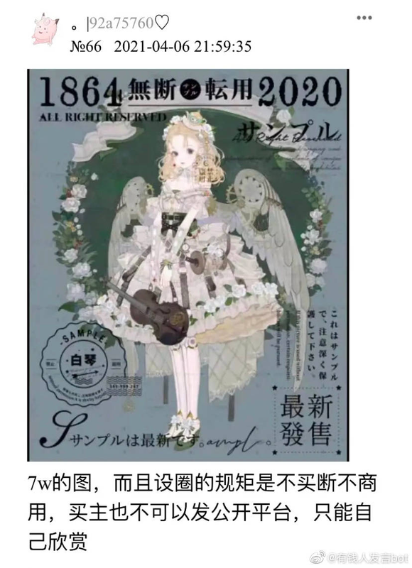 事情的起因是一位名叫芙芙的未成年女孩,通过网络平台“米画师”向画师们约稿,牵扯的画师约有54位,其中最贵的一张为画师白琴所作,单价高达7万。先暂且不论这场牵扯未成年人的巨额交易是否合法有效,这张七万约稿附带的“不能商用,不能公开”的要求,更是令人感到难以理解。