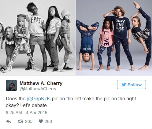 有意思的是,由NFL运动员转行为导演的Matthew Cherry在Twitter上po出了一张Gap早些时候的广告图,图中是黑人女孩把手臂搭在了白人女孩头上。显然,这则广告当时并没有引发“种族歧视”的联想。