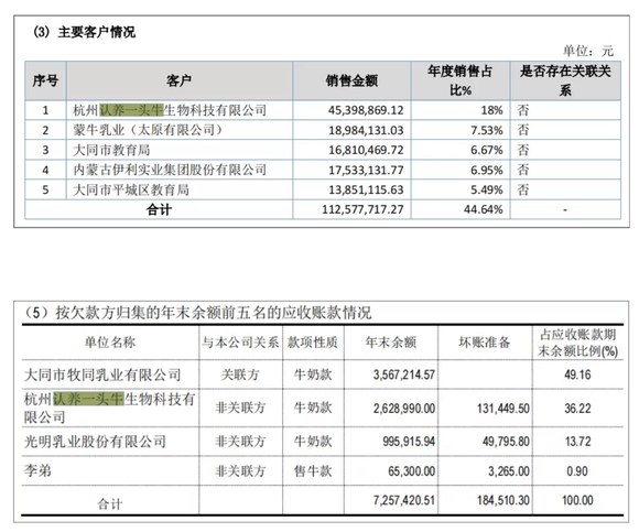 作为山西首家乳制品上市企业,牧同科技3月末发布了它的首份年度报告。数据显示,牧同科技的前五大主要客户中,认养一头牛位居第一,销售金额超过4500万,达到了公司年度销售总额的18%。