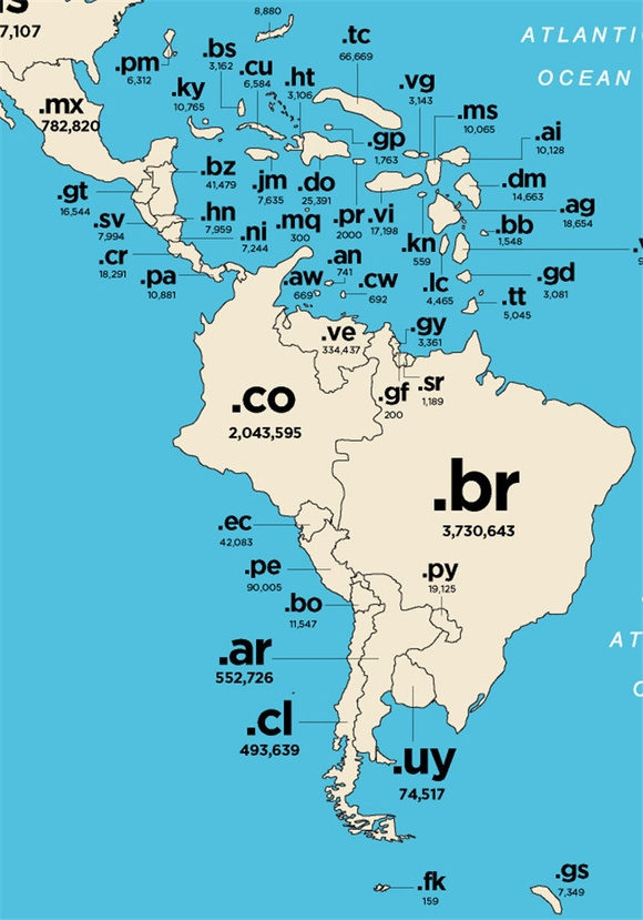 加拿大拥有240万个.ca域名,轻松地打败了美国,但美洲数量最多的国家域名是巴西,它拥有370个.br域名。美洲域名最少的国家是福克兰群岛,只有159个网站以.fk注册。即使是完全无人居住的南乔治亚岛和南桑威奇群岛(South Georgia and the South Sandwich Islands)尚且拥有7300个以.gs注册的网站。事实上,这个数量已经很可观——比绝大多数加勒比海国家都要多。那里发生了什么?