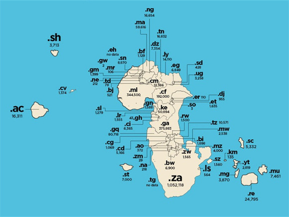 只有15%的非洲人能上网,这也导致这个大陆在域名世界地图上是如此的不显眼。南非(.za)是唯一一个超过百万注册的国家域名,但很多其他的非洲国家甚至都没能超过一千。只有3个以.so(索马里)注册的网站。甚至连南极洲(.aq)都有75个。