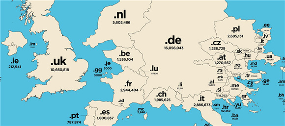 欧洲的域名国土普遍很大,其中德国遥遥领先。英国(.uk)是世界第四大国家域名(106万)。每隔20秒就有一个新网站以.uk注册。荷兰(.nl)560万的国家域名轻松地超过了真实国土面积更大的法国(.fr,290万)、波兰(.pl,270万)以及意大利(.it,290万)。有趣的是,南斯拉夫虽已作古,但以其域名(.yu)注册的网站却相当可观,32000个网站,是波斯尼亚国家域名(.ba)的两倍)。