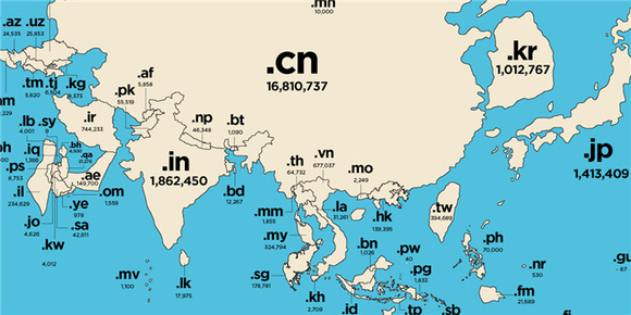 在亚洲和大洋洲,中国以1680万的国家域名总量将俄罗斯、印度、澳大利亚、日本和韩国等其他百万级域名国家远远甩在身后。朝鲜似乎没有一个以国家域名注册的网站;某些朝鲜人不是也能够上网的吗?