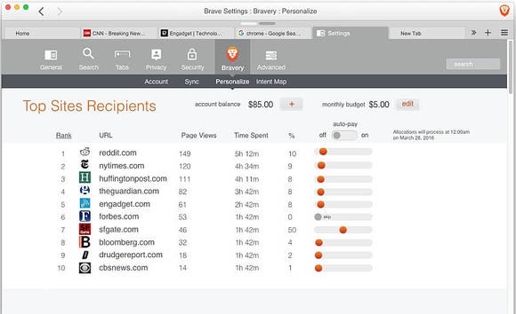 对于广告分成,Brave提出了自己全新的模式:拥有网站的出版商们获得广告收入的55%,Brave拿15%,还有15%给设计广告的合作伙伴,最后10%-15%会返还给看广告的用户。也就是说,网站的广告收入完全来自选择跟Brave合作的广告商,而看广告的网民还能赚钱!当然,这些钱是以比特币的形式发放,用户可以打赏给那些喜欢的网站。所以,Brave的终极目标并不是完全消灭广告,而是改变广告浏览的体验。