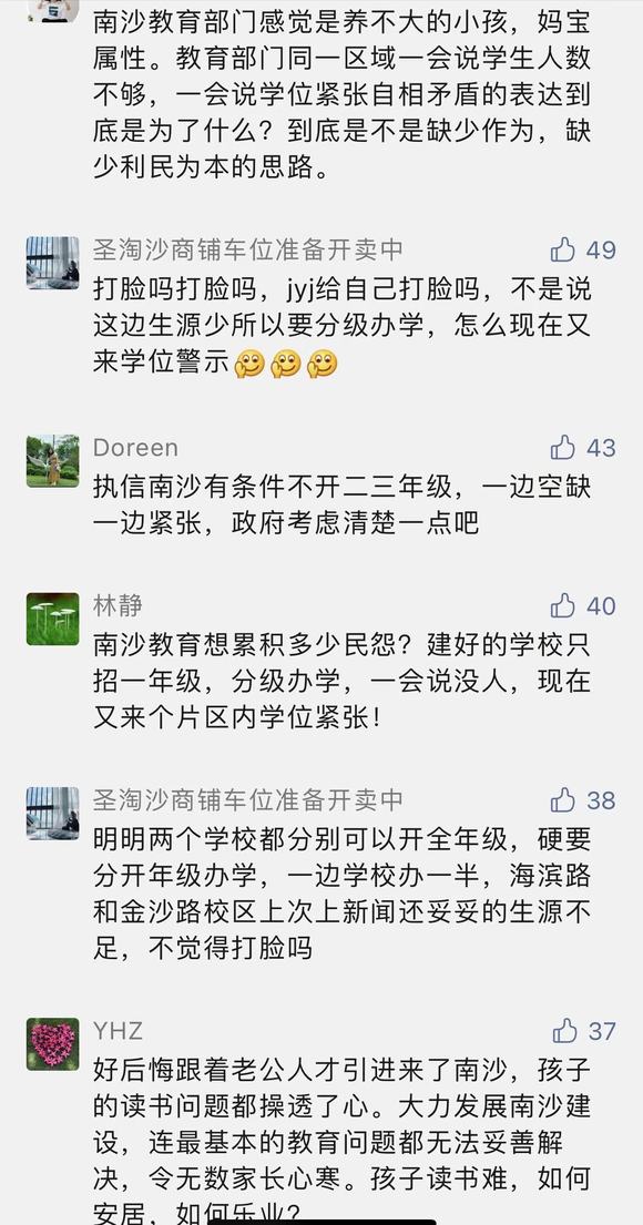 对于南沙教育局此次发布的学位预警,多位家长在网上表示不解和不满,甚至没反应过来。南沙部分学校前脚还因学生人数不够要分校区、分年级办学,后脚却又发布学位预警。