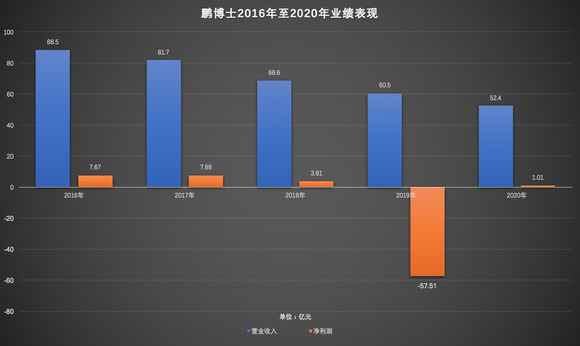 但在2017年,鹏博士的收入则出现增长停滞的情况,录得81.70亿元的营收,同比骤降7.68%。2018年、2019年,鹏博士的营收分别为68.60亿元、60.50亿元,分别同比下降16.03、11.81%。