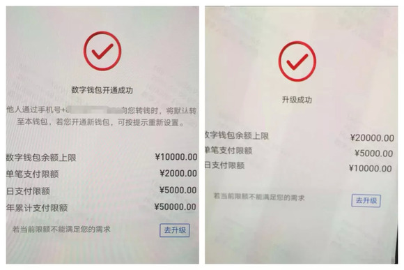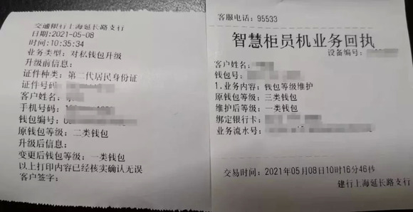 其实,背后升级的逻辑是相同的,只不过是在智能机具上集合办理了。记者的建设银行数字人民币三类钱包先在智能机具绑定了名下的工商银行储蓄卡,然后通过建行工作人员面审,便升级为一类钱包。建设银行一类钱包无余额上限、无单笔支付限额、无日累计支付限额及年累计支付限额。