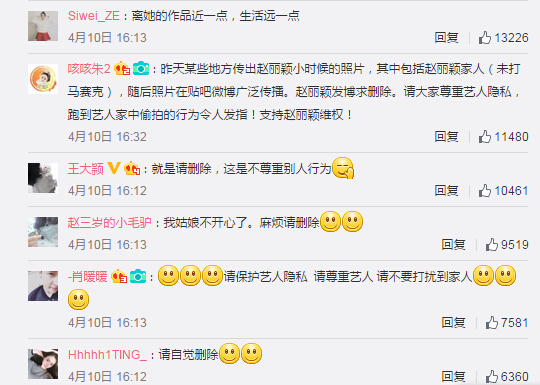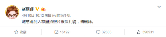 随后赵丽颖更发微博斥责网友:“随意跑到人家里拍照片很没礼貌,请删除。”