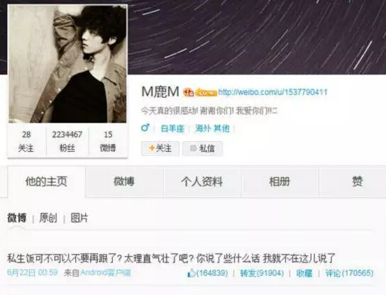 鹿晗也经常被私生饭跟踪,甚至被私生饭用针孔摄像头偷拍,该粉丝还把视频传到了网上。