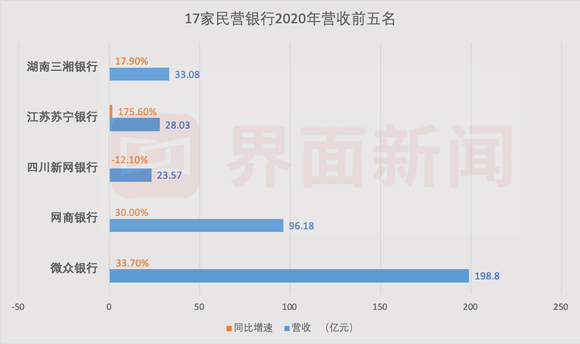营收方面,微众银行同样独占鳌头,全年实现营收198.8亿元,占17家民营银行净利润总和之比超4成。排在第二位的网商银行营收为96.18亿元,与微众银行相差超百亿元。排名第三的湖南三湘银行与第二位的差距进一步拉大,营收为33.08亿元。排名第四和第五的是苏宁银行和新网银行,营收分别为18.03亿元和23.57亿元。