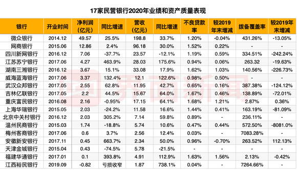 2020年,经历新冠疫情的“大考”,大部分民营银行的不良贷款率均有所上升,仅微众银行和新安银行不良率较上年末实现下降,分别下降0.04个百分点和0.7个百分点。在披露业绩的17家民营银行中,富民银行不良率最高,为1.68%,而金城银行未披露其不良率。