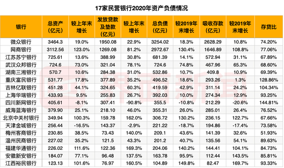 从资产负债规模来看,2020年,仅新网银行和金城银行资产、负债双双“缩表”。