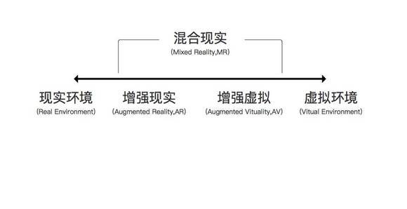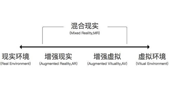 我把暂且把这张图叫做「现实-虚拟」区间(reality-virtuality continuum)。区间向左至无穷表示「现实环境」,依次向右为「增强现实(AR)」、「增强虚拟(AV,Augmented Vituality)」,直到向右至无穷表示「虚拟环境」,而「混合现实」则包含了「增强现实」与「增强虚拟」。