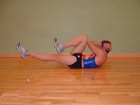 空中蹬车:仰卧在地板上,下背部紧贴地面。双手放在头侧,手臂打开。将腿抬起,缓慢进行登自行车的动作。呼气,抬起上体,用右肘关节触碰左膝,保持姿势2秒钟,然后还原。再用左肘关节触碰右膝,同样保持2秒钟,然后慢慢回到开始姿势。