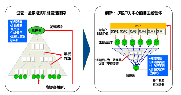 扭转传统的管理思路,倒金字塔式管理,实行自主经营体向市场要效益,一切面向用户。