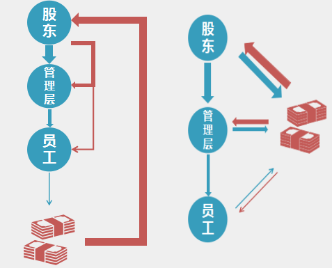 传统企业管理决策从上向下级级传达,但被动接受指令的下级因理解能力、个人利益和主观动力等原因会导致执行力度层层递减,最终导致经营效率的损失。